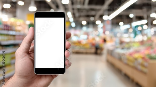 Smartphone in the Grocery Aisle: A hand holds a smartphone with a blank screen, positioned against the backdrop of a brightly lit grocery store aisle.