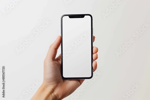 Smartphone mockup on hand with white blank screen created with Generative AI
