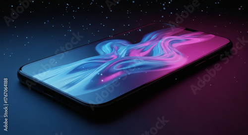 smartphone, technology, surface, glasses, back, pattern, holographic, dynamic, fluid, water, silk, matte, rendering, three-dimensional, photorealistic, concept, product, futuristic, colours, iridescent, blue, purple, pink, depth, background, dark, particle, light, minimalist, device, isolated, intangible, magic, clean, studio, lighting, professional, visualisation, premium, electronic, phone, screen, communication, digital, mobile, business, mobile phone