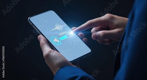 Smartphone Update Progress: Close-up of Hand Touching Screen During Software Installation for Improved Functionality