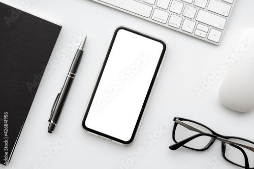 Smartphone with blank mockup screen is on top of white office desk table with supplies. Top view with copy space, flat lay.