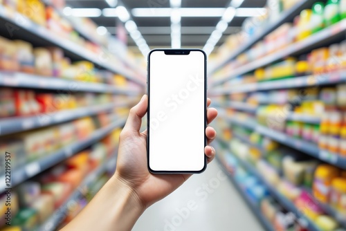 Smartphone with blank white screen held by hand in a supermarket aisle background.