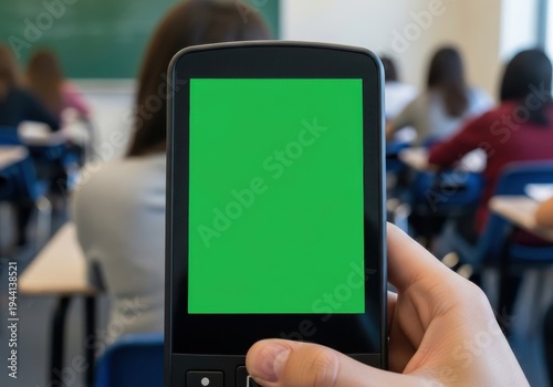 Smartphone with Green Screen in Classroom, Mockup for Education and App Display