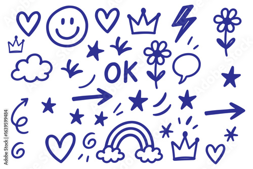 Smile brush hand drawn vector element set. Emoji fun face, heart, crown symbol crayon texture marker background kid sketch style hand drawn element. Color smiley face, arrow. Vector illustration