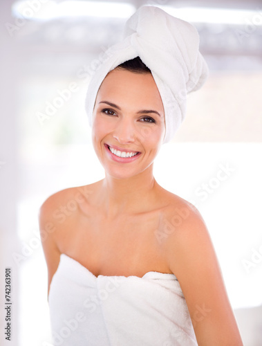 Smile, towel and portrait of woman with hygiene for skincare, health and shower in bathroom. Beauty, treatment and female person with happiness for dermatology, cosmetics and morning routine