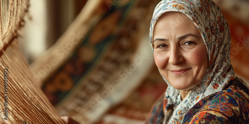 Smiling 48-Year-Old Turkish Woman Weaving Carpets for Breast Cancer Awareness