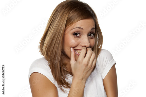 woman, shy, smile, shame, embarrassed, face, girl, person, young, beautiful, female, attractive, hand, background, white, isolated, people, shyness, happy, pretty, brunette, adult, caucasian, friendly, mouth, smiling, beauty, secret, expression, studio, cheerful