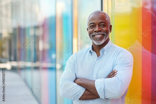 Smiling african american businessman CEO standing proud with arms crossed outside office workplace, colorful, reflective glass building, copy space, Generative AI