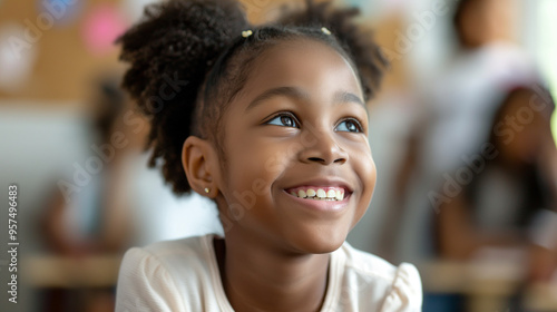 african american, girl, smiling, excited, classroom, happiness, education, student, elementary school, learning, school, joyful, back to school, bright, childhood, diverse, academic, engagement, positive, innocence, cheerful, social skills, happy child, friendly, black