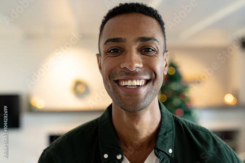 Smiling african american man at home with Christmas tree in background