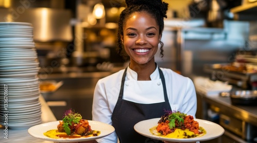 chef, female, eatery, meal, kitchen, african, epicure, plate, smiling, young, adult, culinary, food, cookery, cooking, professional, uniform, happy, dining, delicious, presentation, apron, service, tasty, artistic, vibrant, healthy, herb, garnish, creativity, chef's hat, hospitality, dish, passion, culinary arts, serving, fresh, exquisite, elegant, flavorful