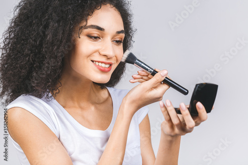 Smiling afro american woman applying makeup powder or foundation with brush isolated on a grey background.