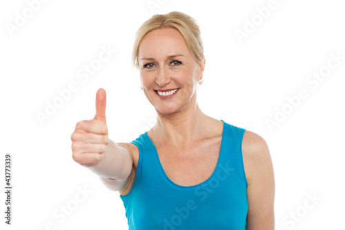 Smiling aged woman showing thumbs up
