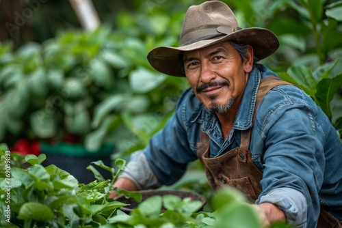 Smiling agricultural worker enjoys working in a field of dense spinach crops under a sunlight
