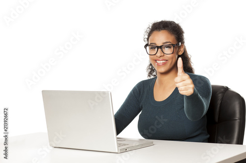 thumb up, woman, laptop, african american, computer, black, happy, goggles, goggles, young, people, person, working, smiling, lifestyle, work, female, portrait, office, latin, latina, cyberspace, notebook, 1, girl, business, attractive, smile, beautiful, white background, blouse, student, beauty, cute, cheerful, surfing, positive, dark skin, ethnic, model, studio, confident, pretty, make-up, isolated, long hair