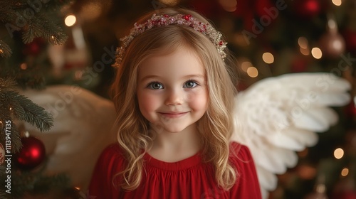 Smiling Angelic Girl in Red by Christmas Tree at Orphanage