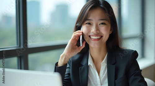 Smiling Asian businesswoman in a suit talking on her phone in a modern office setting.
