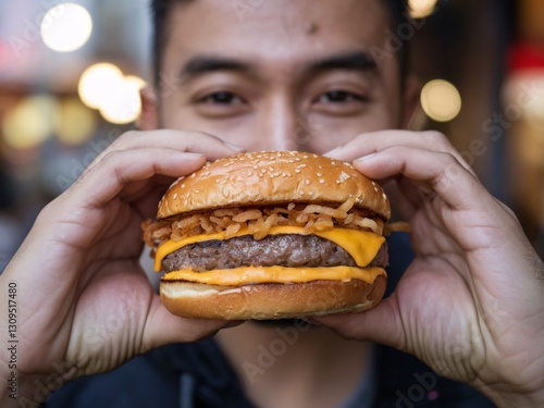 burger, cheeseburger, male, asian, hand, food, smile, onion, sesame, beef, meal, closeup, delicious, appetising, fast food, eatery, epicure, tasty, snack, dinner, lunch, dining, unhealthy, capture, cookery, fried, savour, hamburger, enjoy, eating, indulgence, crispy, sharpened, colourful, texture, yum, satisfaction, man, happy