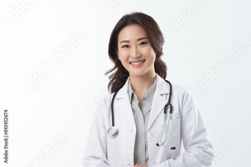 Smiling asian woman doctor on white background. Woman doctor. World of Medicine. Personal care profession. Medical studies. European doctor. Asia. Asian doctor. China. Japan. AI.