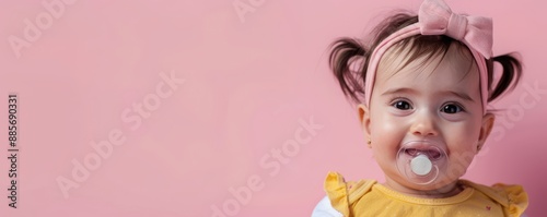 Smiling baby girl with pacifier portrait on flat pink background. Free copy space for banner.