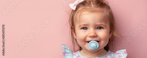 Smiling baby girl with pacifier portrait on flat pink background. Free copy space for banner.