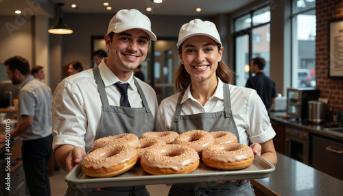 bakery, donut, men at work, smiling, coffee, fresh, pastry, dessert, sweet, celebration, uniform, teamwork, baking, treat, food, glaze, young adult, apron, customer service, small business, cheerful, homemade, delicious, tasty, culinary, breakfast, snack, happy, cooking, festive, casual attire, food industry, joy, together, tradition, professional, community