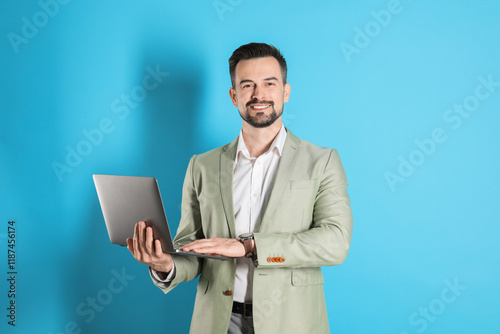 Smiling banker with laptop on light blue background