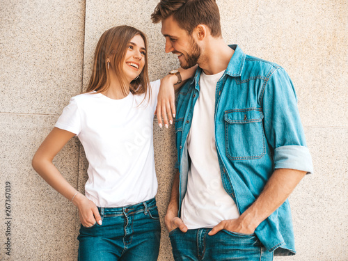 Smiling beautiful girl and her handsome boyfriend in casual summer clothes. Happy cheerful family having fun on the street background. Looking at each other