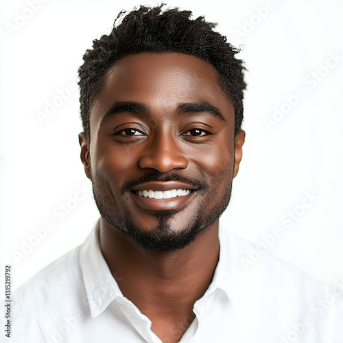 Smiling Black Male Headshot: Casual Attire, Professional & Confident Portrait on White Background