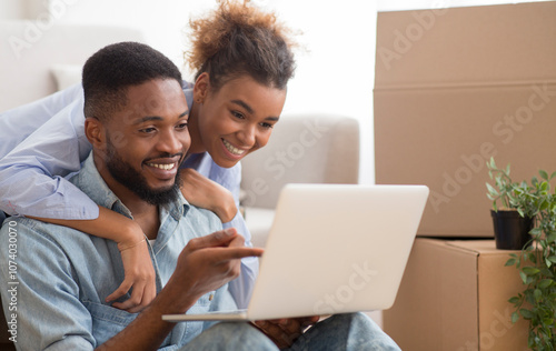 browsing, web, renting, technology, family, flat, computer, buying, moving, lifestyle, young, happy, background, couch, home, man, black, using, apartment, husband, new, cardboard, wife, laptop, sitting, mortgage, afro, people, 30s, relocation, box, selective focus, indoor, couple, concept, candid, house, african american, woman, adult, property, packing, rent, smiling, finger, pointing, online, shopping