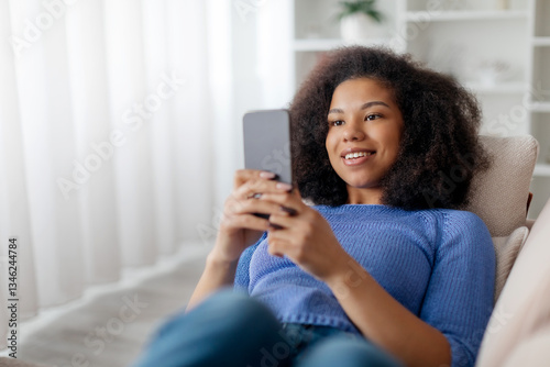 african american, black, woman, home, people, domestic, indoor, casual attire, smartphone, digital, technology, social, media, texting, scrolling, chatting, online, virtual, cyberspace, relaxation, happy, smiling, comfortable, lifestyle, leisure, modern, wireless, entertainment, enjoyment, fun, cosy, stylish, trendy, communication, engagement, remote, positive, unwind, connection, sharpened, browsing, watching, message, interactive, content, multimedia