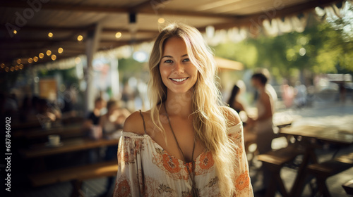 smiling blonde at restaurant table, joyful dining, good warm summer weather, fictional location