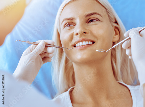 Smiling blonde woman examined by dentist at dental clinic. Healthy teeth in medicine concept
