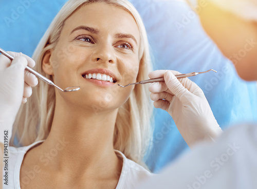 Smiling blonde woman examined by dentist at sunny dental clinic. Healthy teeth and medicine concept