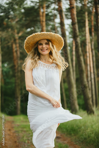 Smiling blonde woman wearing white dress and straw hat walking in forest