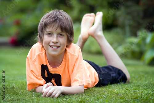 boy, little boy, garden, smiling, happy, summer, lying down, one person, 1, t-shirt, casual clothes, casual clothes, barefoot, orange, caucasian, brown hair, relaxed, lawn, grass, outdoors, children, male, preteen, confident