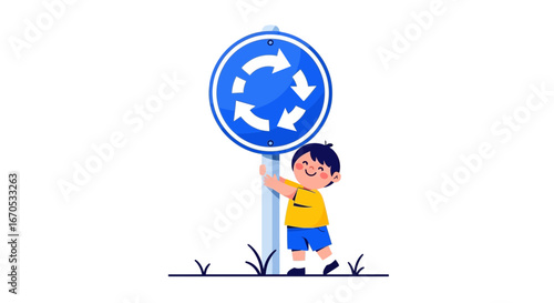 roundabout, traffic, signs, boy, arrow, vector, children, road, circle, blue, transport, direction, children, symbol, illustration, cartoon, street, safety, design, drive, learning, education, urban, regulation, cheerful, cute, guide, happy, journey, motion, movement, navigate, route, signage, travel, warning, way, pedestrian, zone, junction, graphic, style, isolated, destination