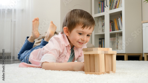 Smiling boy lying on floor and building house or tower from wooden blocks. Concept of child education and games at home