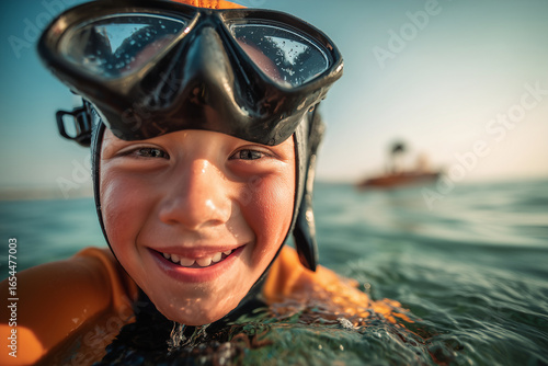 Smiling boy wearing diving mask in water, enjoying summer vacation and underwater adventure with happiness and excitement.