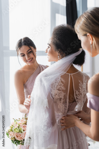 smiling bridesmaids preparing african american bride for wedding, blurred foreground.