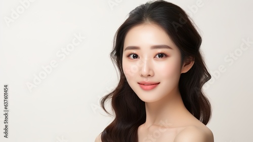 smiling brunette woman with long hair poses in a studio, showing off her fresh skin and happiness
