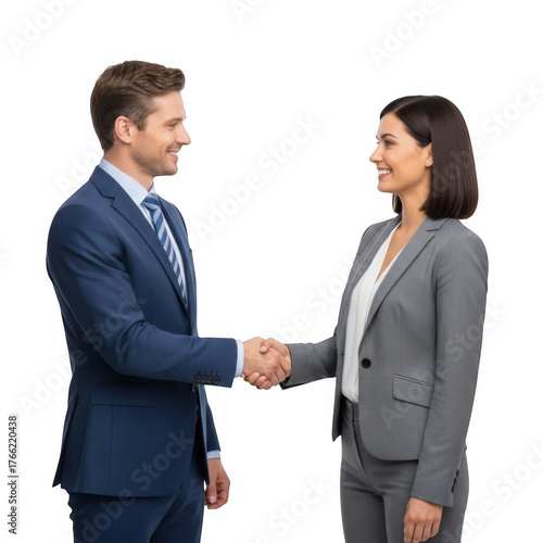 business, handshake, agreements, deal, partnership, success, collaboration, meeting, people, man, woman, caucasian, suit, attaching, blazer, professional, corporate, office, communication, greeting, friendly, happy, positive, teamwork, isolated, transparent, background, cut-out, businessperson