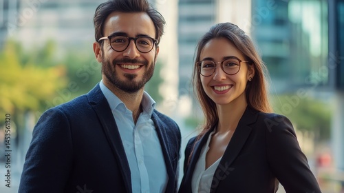 smiling businessman and a casual businesswoman posing for a portrait outdoors, cityscape in the background