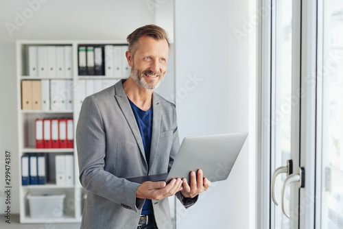 businessman, man, online, e-business, notebook, laptop, computer, business, entrepreneur, copy space, communication, hand-held, smiling, employee, mobility, office, person, professional, men at work, standing, door, waiting, watching, executive, senior, manager, workplace, 50s