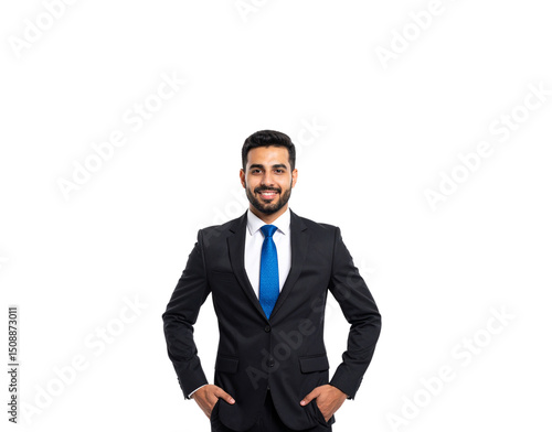 man, suit, attaching, blue, shirt, white, smiling, businessman, professional, formal, confident, executive, corporate, attire, clothing, jacket, portrait, person, male, beard, hair, dark, looking, front, view, elegant, style, fashion, photogenic, adult, young, leader, success, happy, positive, smart, modern, office, job, work, employee, manager, entrepreneur, occupation, career, business, man, 1, isolated