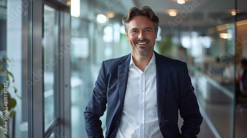 smiling businessman or CEO of a company in modern office, portrait of a smiling person in office, corporate life