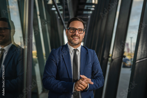 businessman, smiling, suit, attaching, office, building, modern, glasses, hallway, confident, success, business, professional, corporate, executive, male, entrepreneur, leader, manager, men at work, white-collar, finance, career, job, work, achievement, deal, anticipation, excited, happy, portrait, window