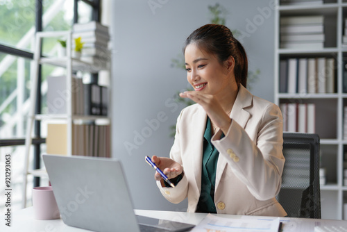 woman, business, office, computer, laptop, working, businesswoman, desk, technology, cyberspace, asian, smiling, happy, professional, online, meeting, video, call, communication, corporate, executive, manager, work, female, entrepreneur, success, confident, indoor, 1, person, adult, young, looking, away, sitting, using, day, bright, cheerful, white, collar, connection, wireless, modern, window, bookcase, paperwork, asia