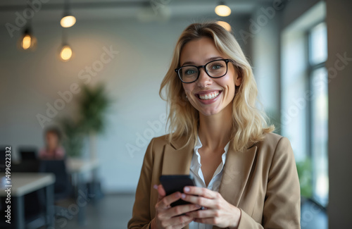 Smiling businesswoman in modern office setting. Female pro with smartphone, wearing stylish eyeglasses. Happy lady in beige suit, work attire, corporate environment, career success, technology use.