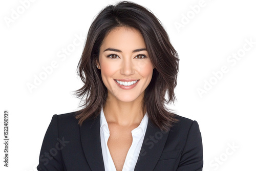 Smiling businesswoman portrait, shoulder-length brunette hair, black suit jacket, white shirt, transparent background